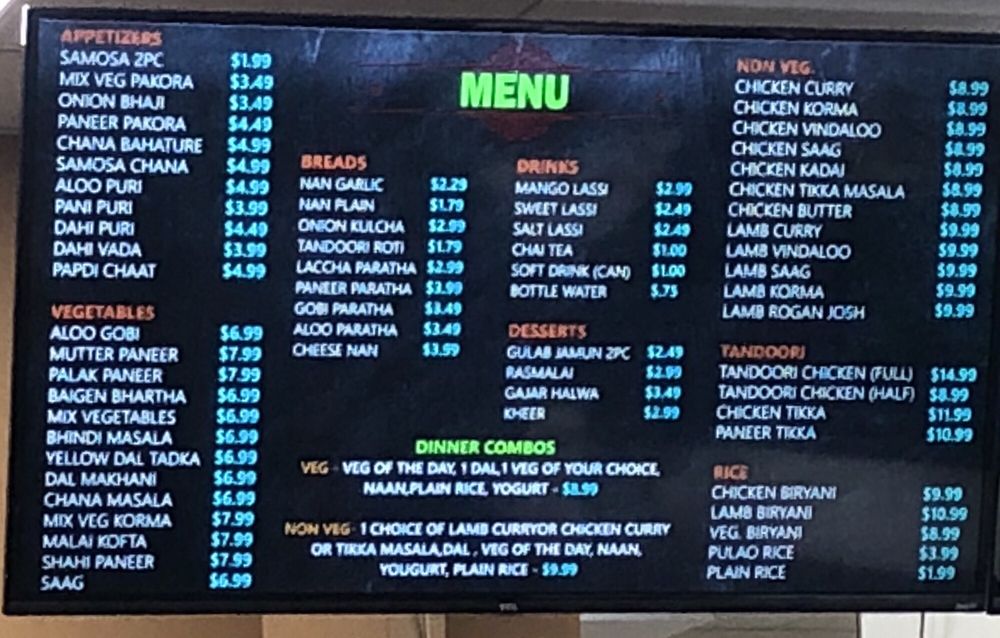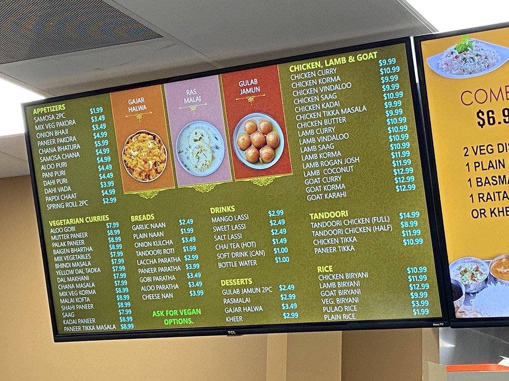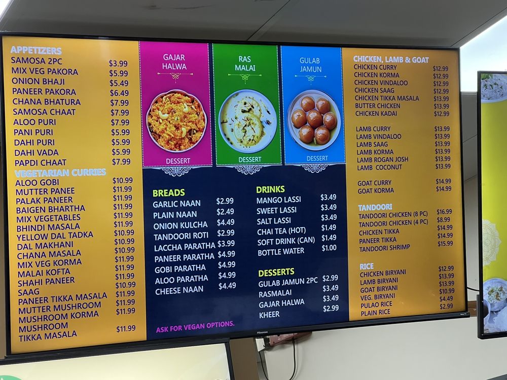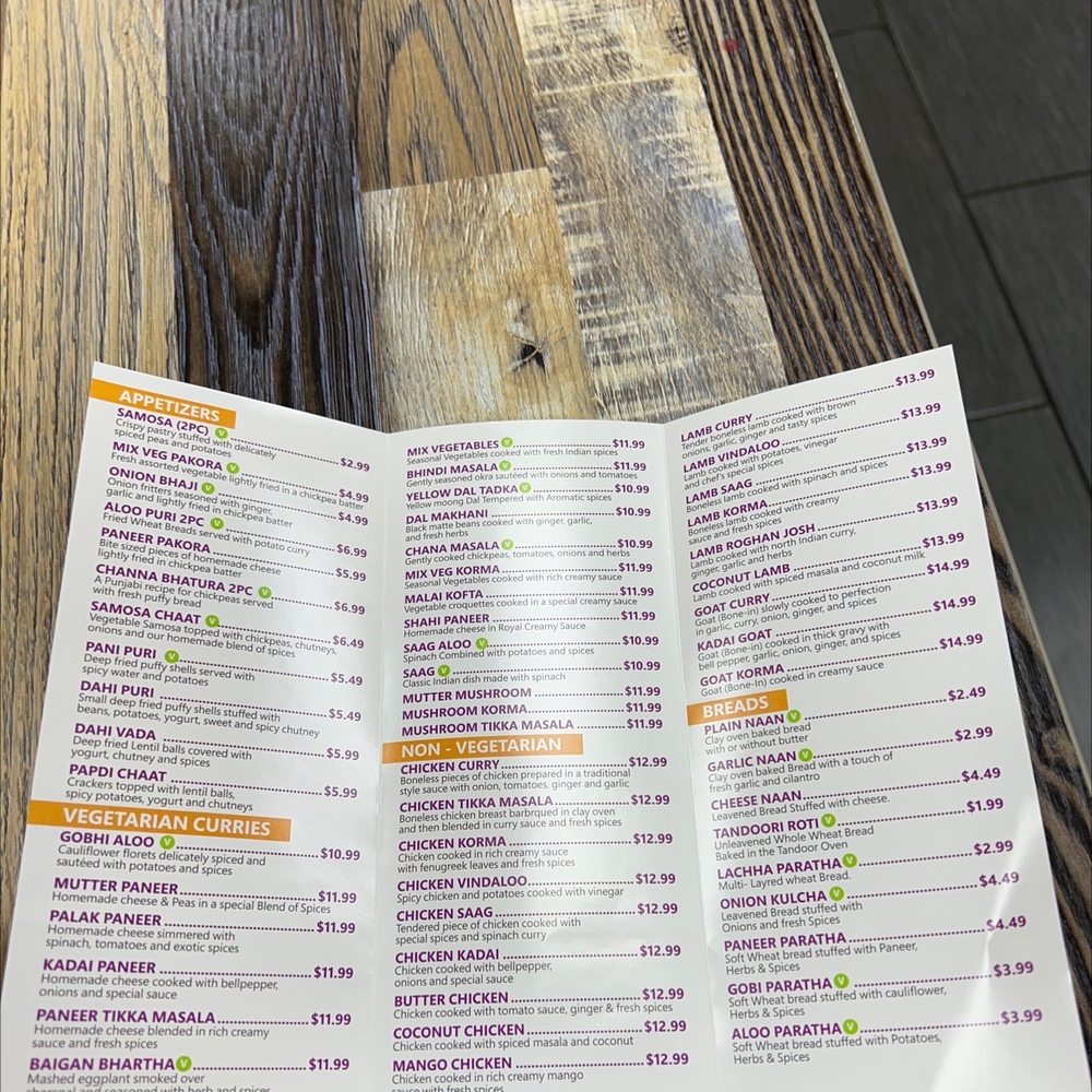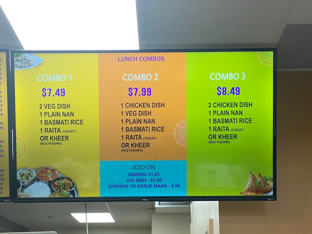 1 choice of Lamb curry or chicken curry or chicken tikka masala, dal, veg of the day, plain naan, yogurt (raita) and rice.
